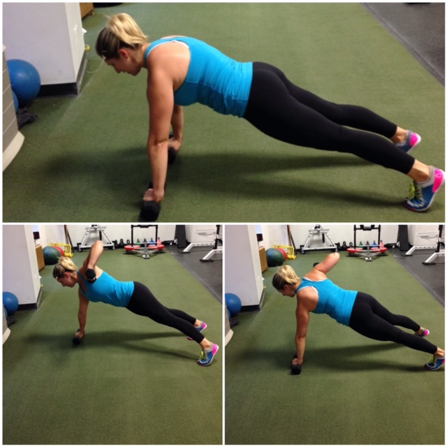 Begin in the top of a push-up position, holding onto a dumbbell with each hand. Engage the core by pulling in the belly, slightly tuck your butt and press out through the back of the legs, make sure you don’t cave in through the shoulders by slightly rounding the back. Lift one arm off the ground by bending the elbow and transferring your weight to the other arm, avoid twisting at the hips. Slowly lower the weight and repeat on the other side. Do 6 rows per side so 12 total per set.