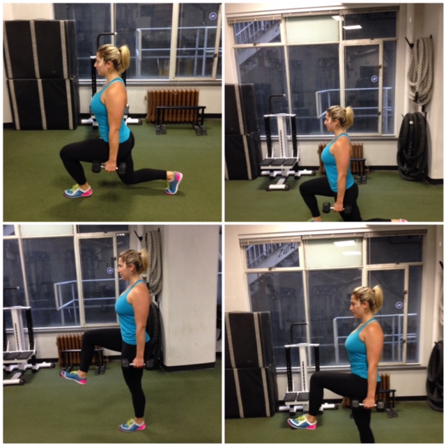 Begin in a neutral standing position with a dumbbell in either hand. Check your posture to ensure your feet are hip width apart, toes are pointed forward and belly is pulled in. Take a big step forward so that your knee is lined up over your ankle, slowly lower the back knee so that it hovers an inch or two off the ground, now using the power of the front foot take a big step forward with the back foot and repeat on the other side. Do a total of 24 walking lunges (12 per side.)