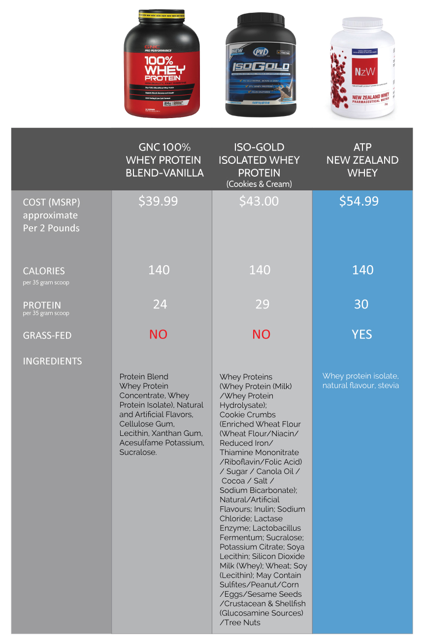 Nutrient wise they are all fairly similar in terms of grams of protein and calories per scoop. Where the biggest difference lies is in the ingredients used, the cheaper options have FAR more ingredients, most of them unrecognizable. You’ll also notice that ATP New Zealand uses whey sourced from grass fed cows, meaning a much more nutrient and anti-oxidant rich product.