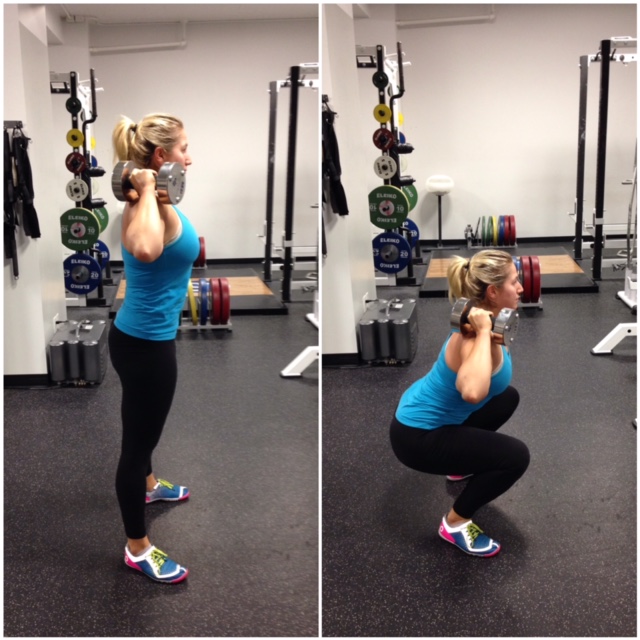 Begin by standing with your feet roughly hip width apart and arms bent at shoulder height holding onto your dumbbells. Sit back as if sitting in a chair, come back up to a neutral standing position. Make sure as you’re squatting down your knees don’t come past your toes, also keep the chest open and avoid caving in at the shoulders. The deeper you squat down the more difficult.