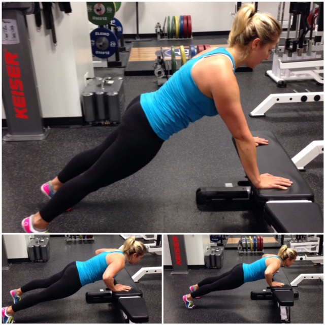 For this exercise you don’t necessarily need a bench, you can also use your bed, or other sturdy surface. Place your hands on an elevated surface slightly wider then shoulder distance, keep the elbows straight. Keeping your body straight, avoid caving through the lower back- keep the core and legs engaged. Bend your elbows so that your upper arms and elbows stay tight to your sides, lower your chest towards the bench and press back up.